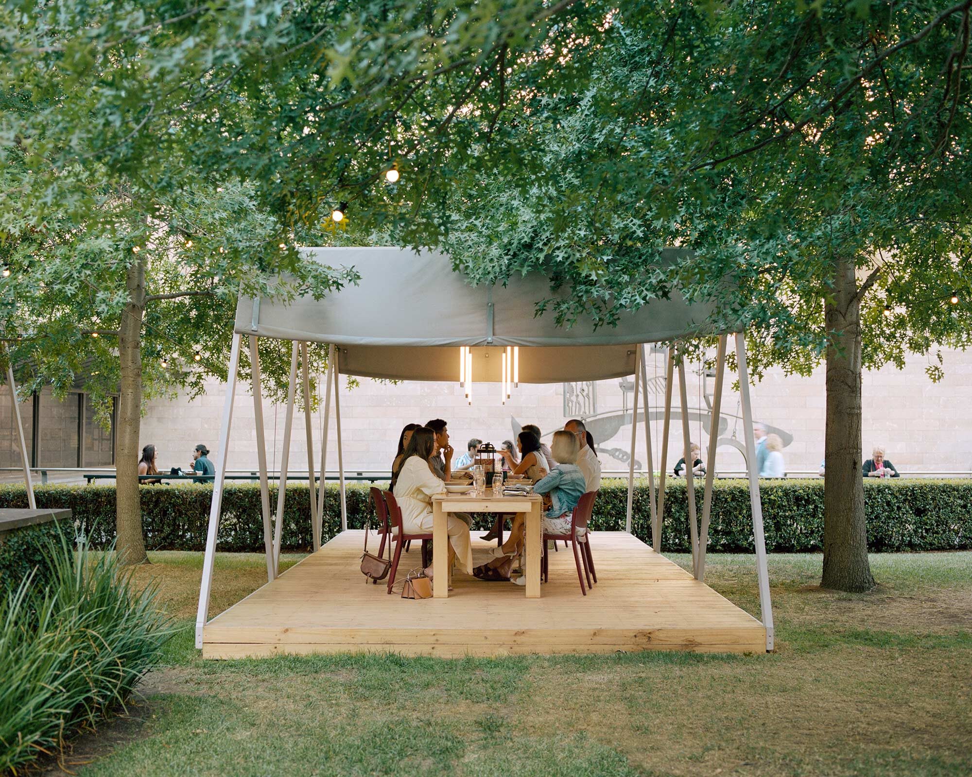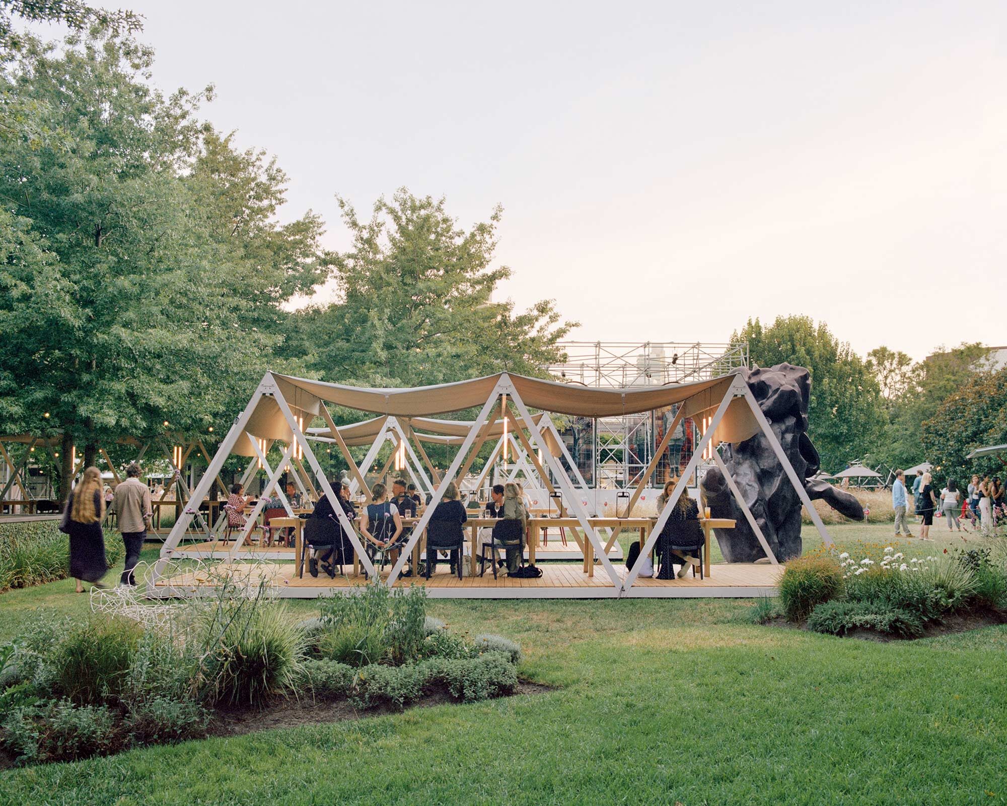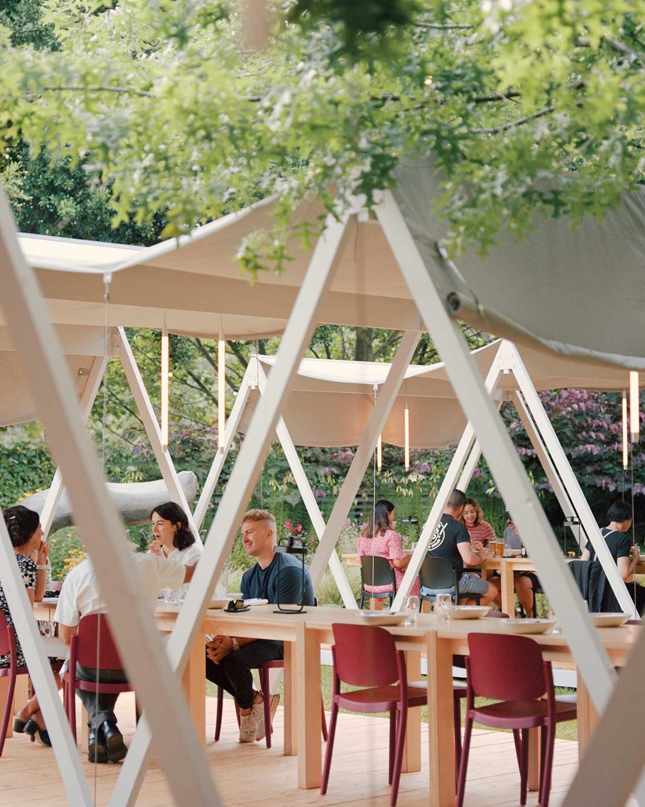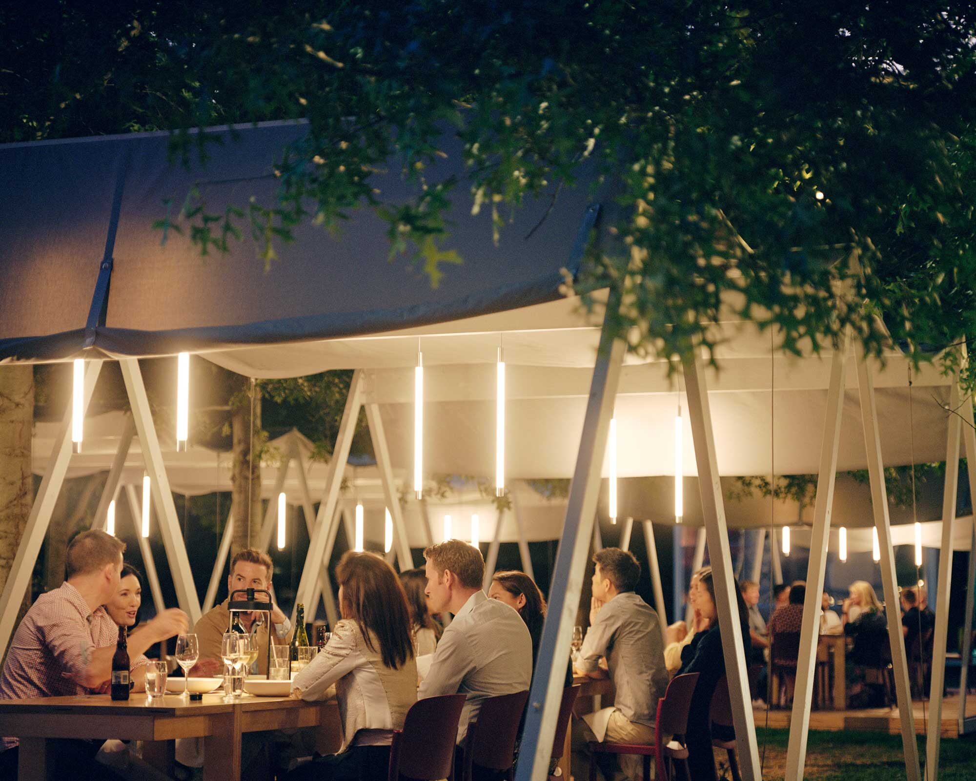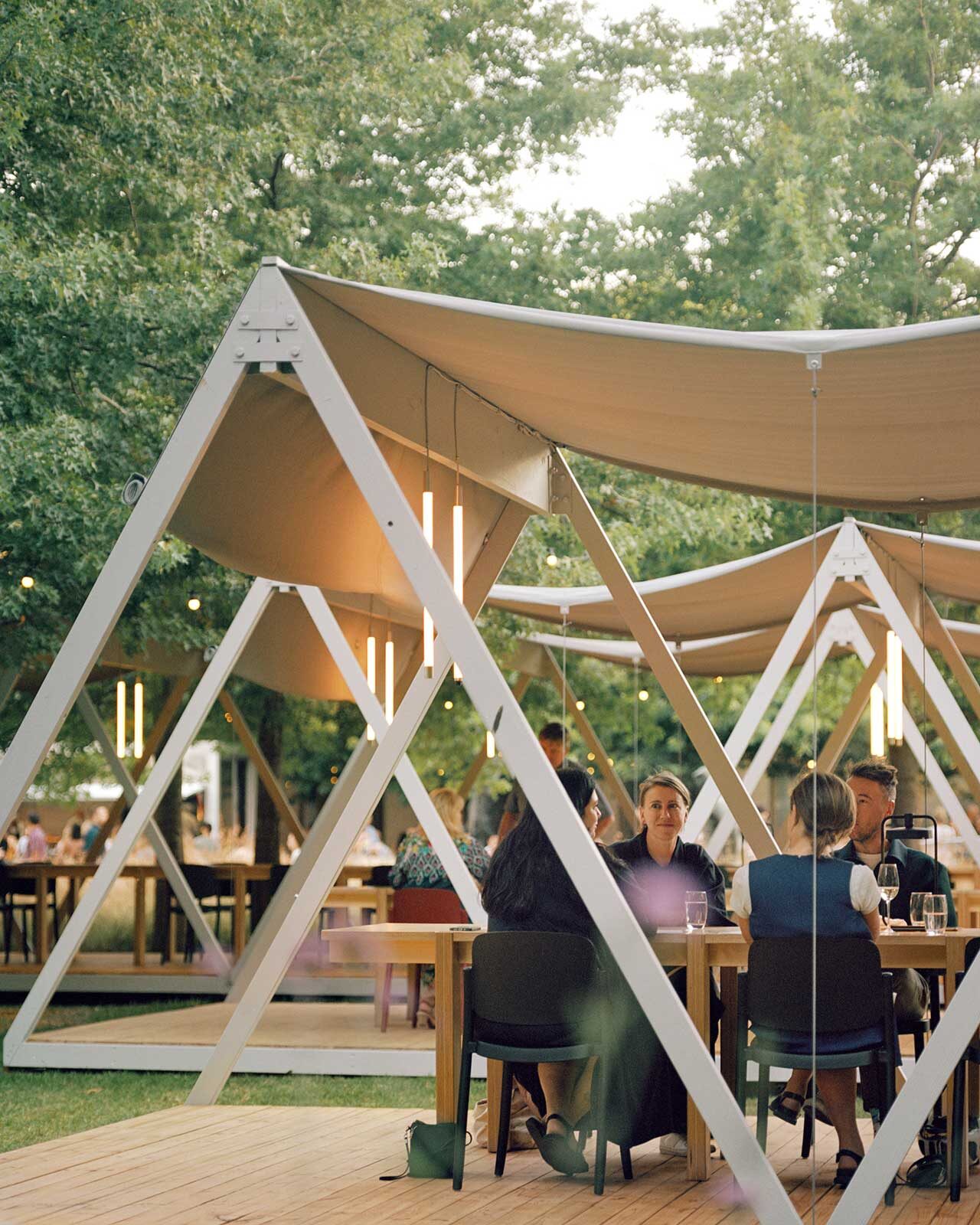 Each pavilion has a repetitive A frame structure nestled between mature trees and a raised deck which avoids disturbing the ground. During the formal dining experience, a canvas roof is slung between the frames with vertical lighting and custom long linear tables. The billowing roofs allow for low lying branches to span overhead unscathed, casting soft shadows across the interior space. With a low soft roof and feeling of being elevated in the garden each pavilion creates a sense of intimate enclosure with minimal means. Like being under a tent awning you feel like you are in an interior space but still in close proximity to the trees, long grass and artworks in the garden.